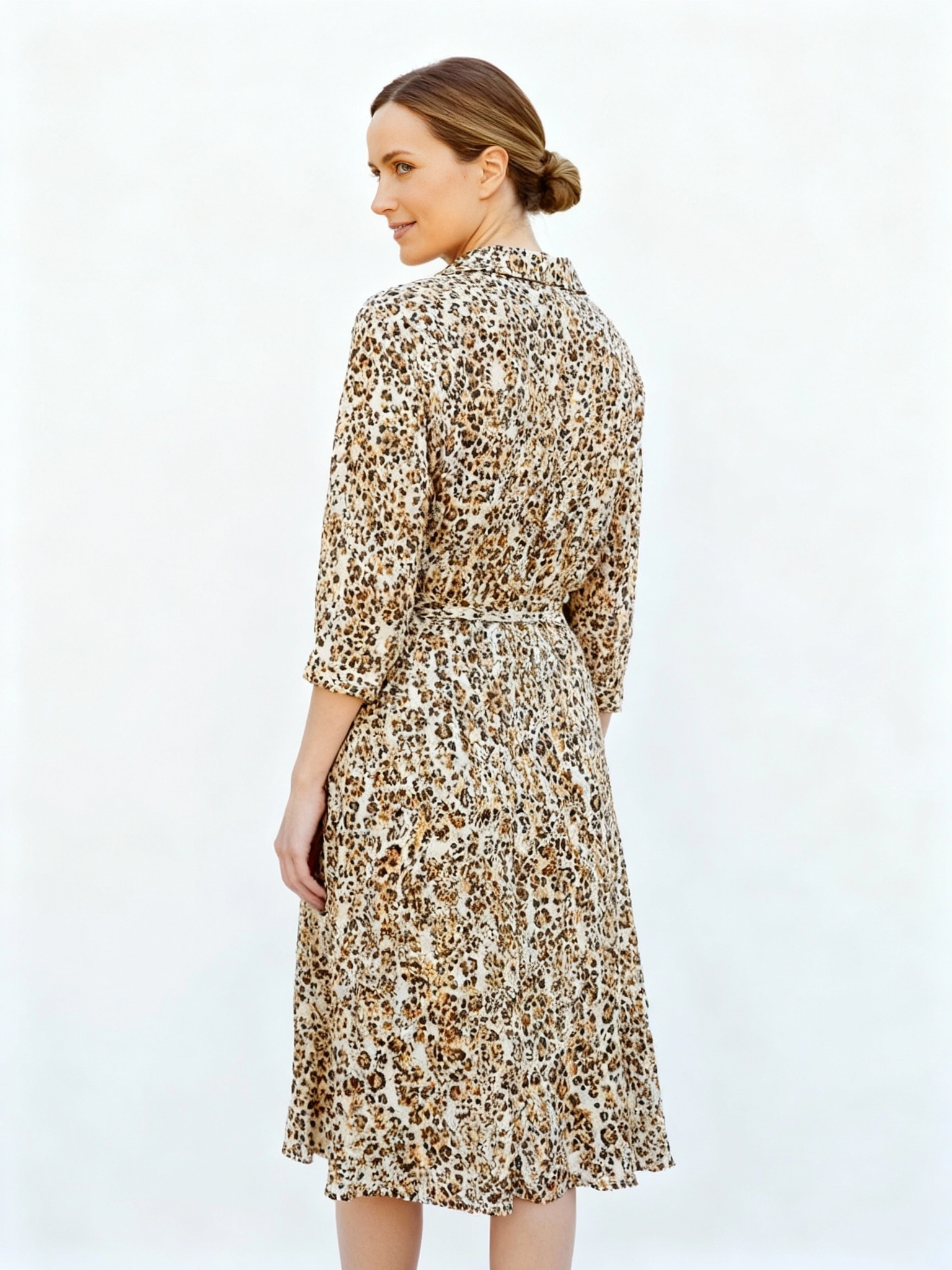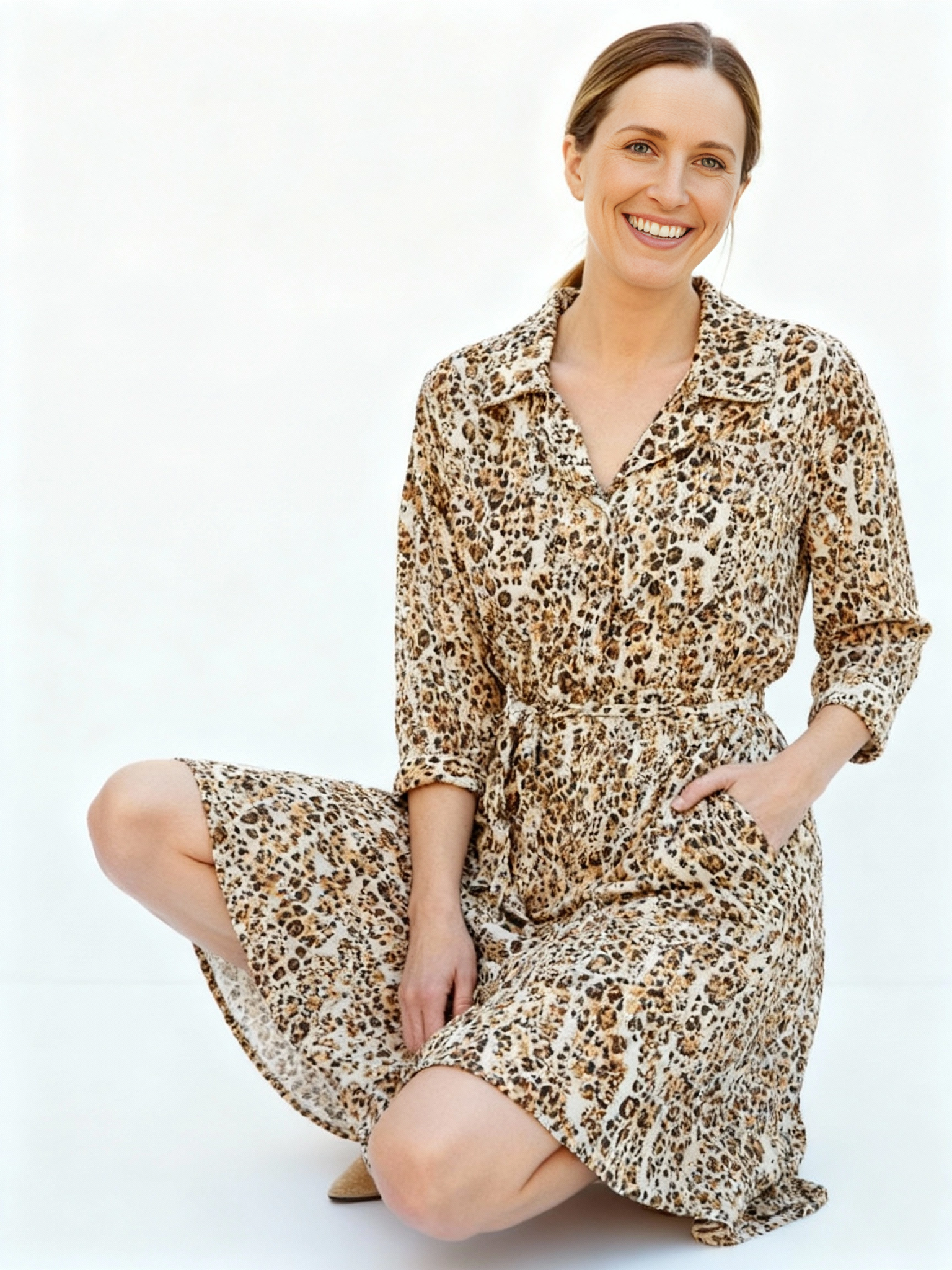 Introducing our leopard Safari shirt dress – the ultimate solution to your wardrobe dilemmas! This dress is packed with all the essentials: collar, button-up closure, short sleeves, self colour belt, knee length, and slight A line hem. Fabric is a gorgeous soft crinkle rayon.