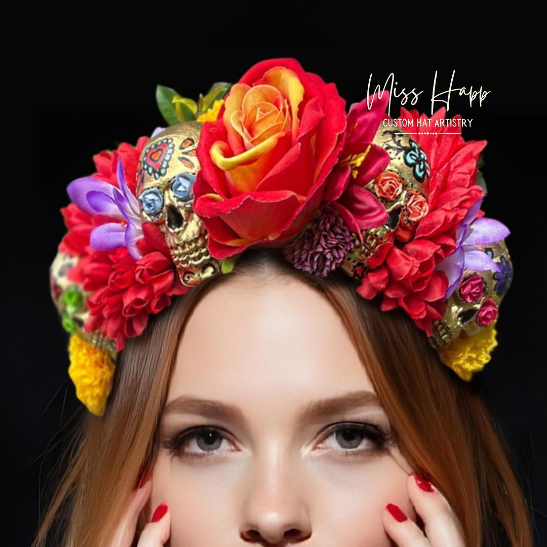 Blooms for the bold, skulls for the soul. This crown was made for nights when flowers and shadows meet. Deep red roses, golden marigolds, and bold carnations bloom alongside hand-sprayed skulls with delicate hand-painted details. This crown is set on a black satin alice band.